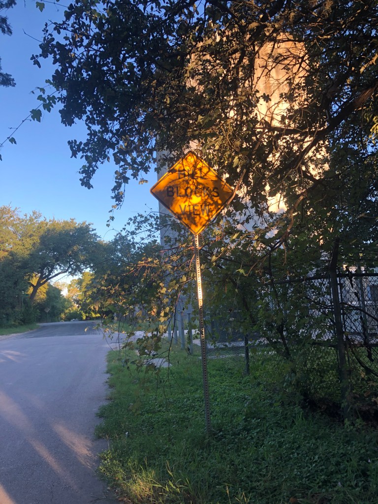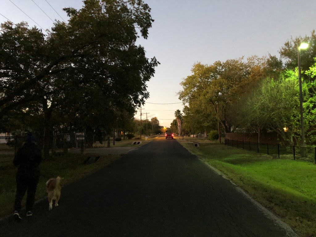 As the sun rises, I walk down a quiet shady street. No sidewalks – a long road with eerie undertones.
