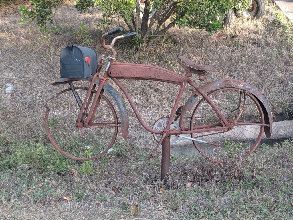 When I first discovered this spooky street, I saw no one out so early in the morning. I passed double-wide trailers with front porches that were permanently planted in large lots. Most yards were mowed and cared for while a few looked like a dumping ground for Frankenstein cars and forgotten toys. A house and a two-story duplex broke up the pattern of mobile homes. One residence had a rusted bike mailbox stand with several vintage cars parked in its side yard. Another place had a huge unhealthy palm tree that looked like a Dr. Seuss drawing and a yard crowded with cacti and tired metal chairs. Near the end of the street a poop-brown trailer had a “Zombie Crossing” sign in a window. Next to that dwelling was the huge Boo Radley house that looked abandoned. It lurked on a deep long lot behind a slanted chainlink fence with several crooked trees and an abundance of trash in the yard.