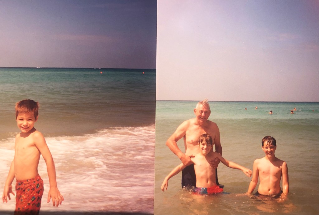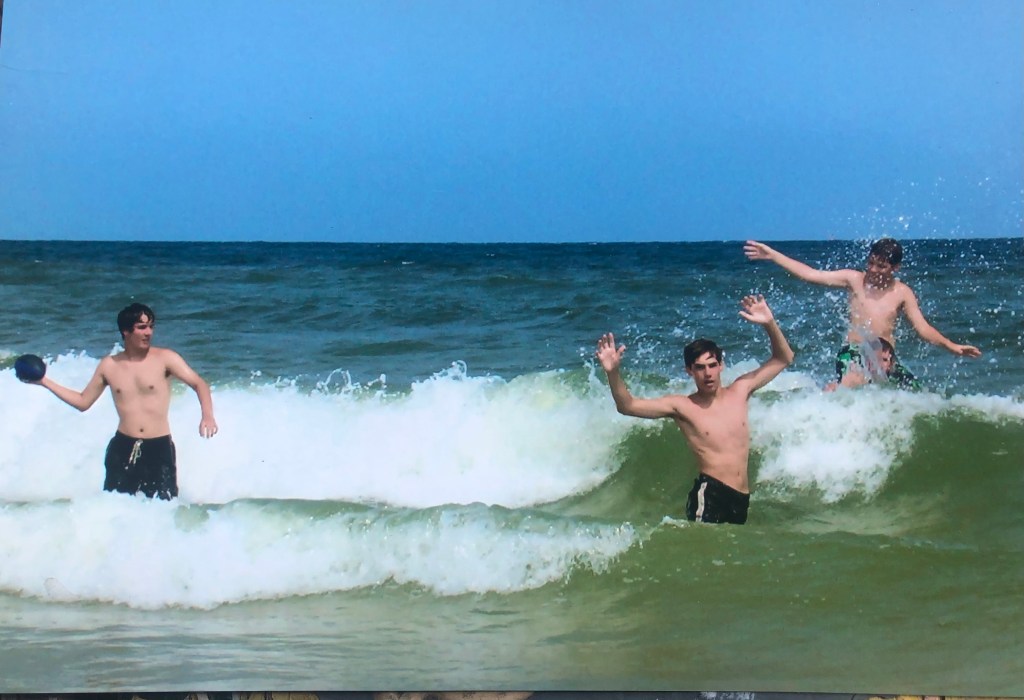 A picture from 2006 hints at the overwhelming pride I have for my three sons. They’re in the frothy waves on a Pensacola beach. The water in the foreground is a light green with a hint of yellow sunshine on one side. Beyond my boys the water goes from steel blue to a deeper (pardon the pun) blue that connects to the calm azure of the sky. They’re in thigh-high water and are caught in stop-action poses. Shane, the oldest, holds a Nerf football that he’s aiming towards his brothers who are both facing straight ahead. He clutches the ball at an awkward angle, illustrating his bookish, nerdy nature. Casey, a few yards away, holds his hands up with palms splayed open as if to say, “Here I am! Watch me!” He’s the only one looking at the camera as if he’s used to getting the world’s attention. Evan, a few feet behind and to Casey’s left, jumps up in the surf. His right arm is straight out and his left is down and away from his side, almost as if he’s balancing on a surf board or dancing across a smooth glass floor. White water droplets surround his face while he smiles at Casey.